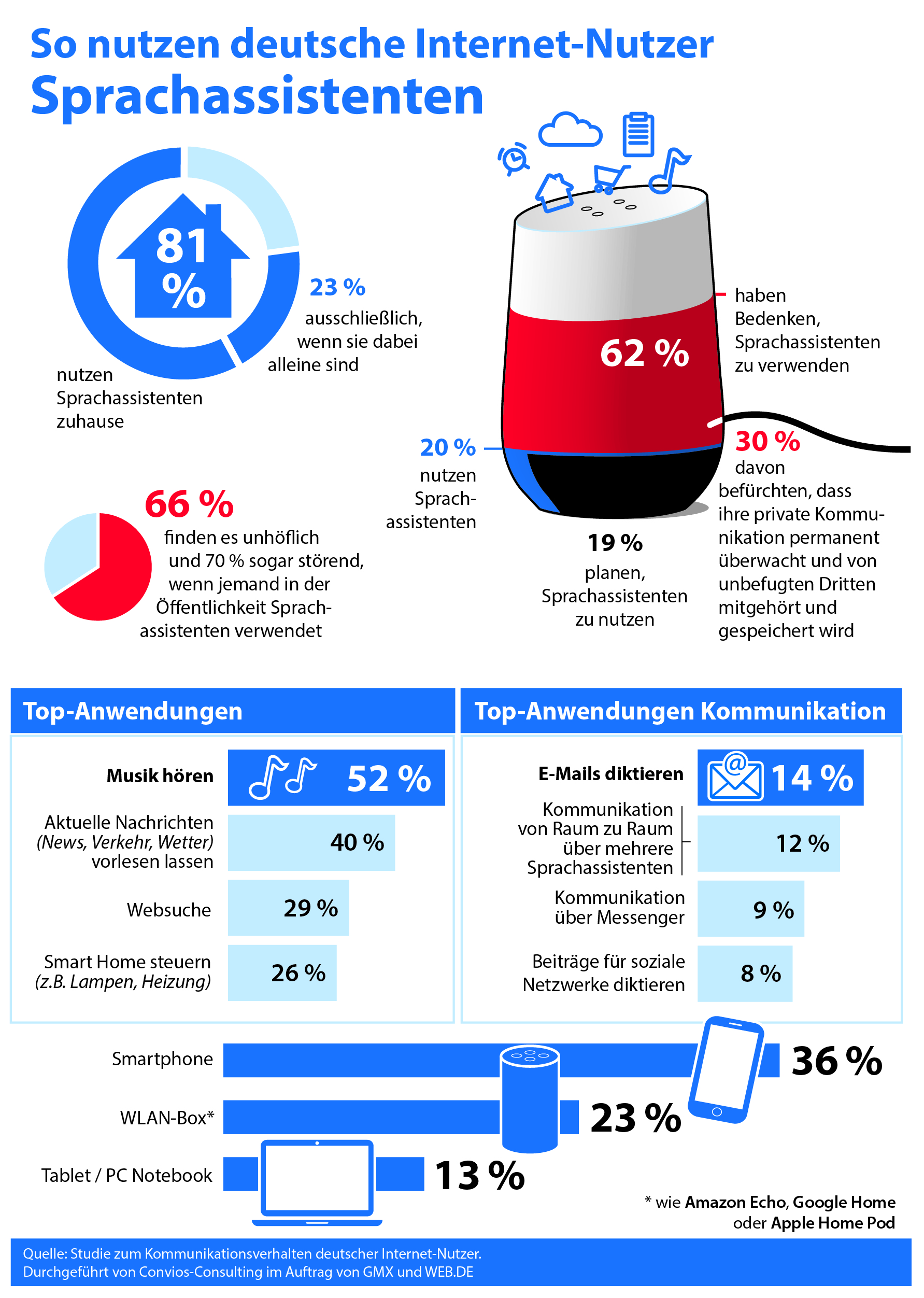 Aktuelle Studie: Jeder Fünfte nutzt Sprachassistenten, ebenso viele planen dies. Top-Anwendung im Bereich Kommunikation ist E-Mail, gefolgt von Messengern. (c) GMX