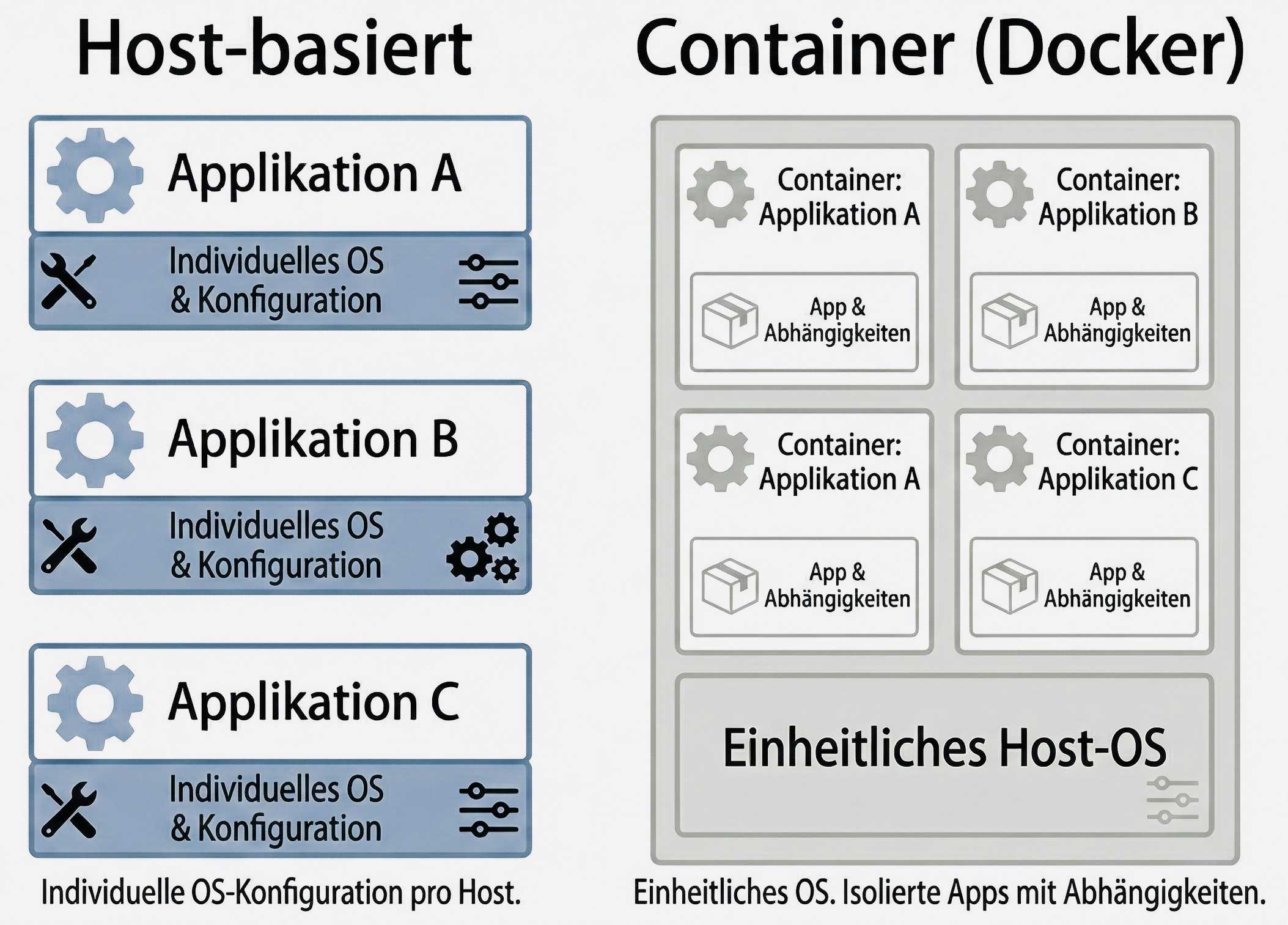 Klassische hostbasierte Systeme müssen individuell konfiguriert werden. Container ermöglichen es, verschiedene Applikationen sicher auf einem Host zu betreiben und vereinfachen so die Verwaltung der Systeme, während deren Auslastung verbessert wird.