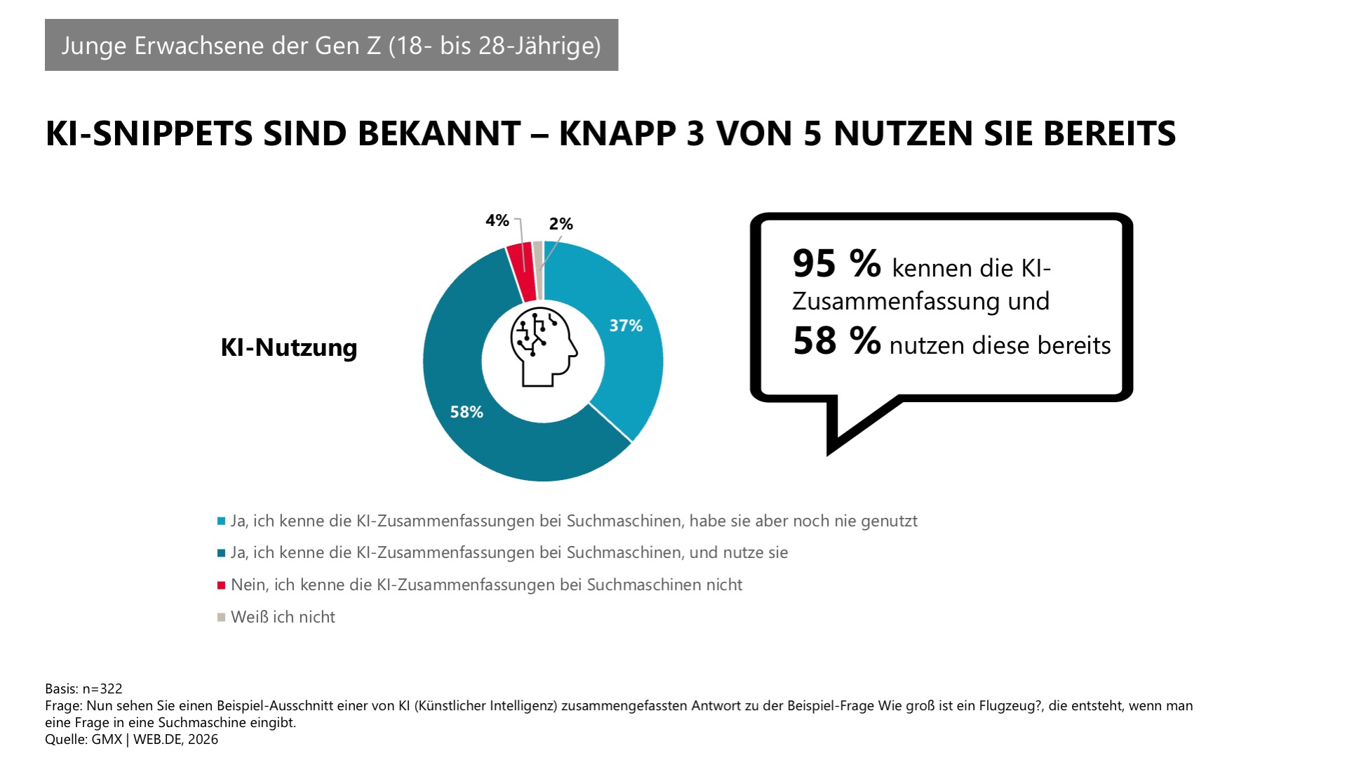 Die Gen Z setzt zunehmend auf Künstliche Intelligenz: Laut der aktuellen Studie "So liest Deutschland Online-Nachrichten 2026" im Aufrag von GMX und WEB.DE kennen 95 Prozent KI-Zusammenfassungen, 58 Prozent nutzen sie aktiv - deutlich mehr als im gesamten Online-Nachrichtenpublikum.