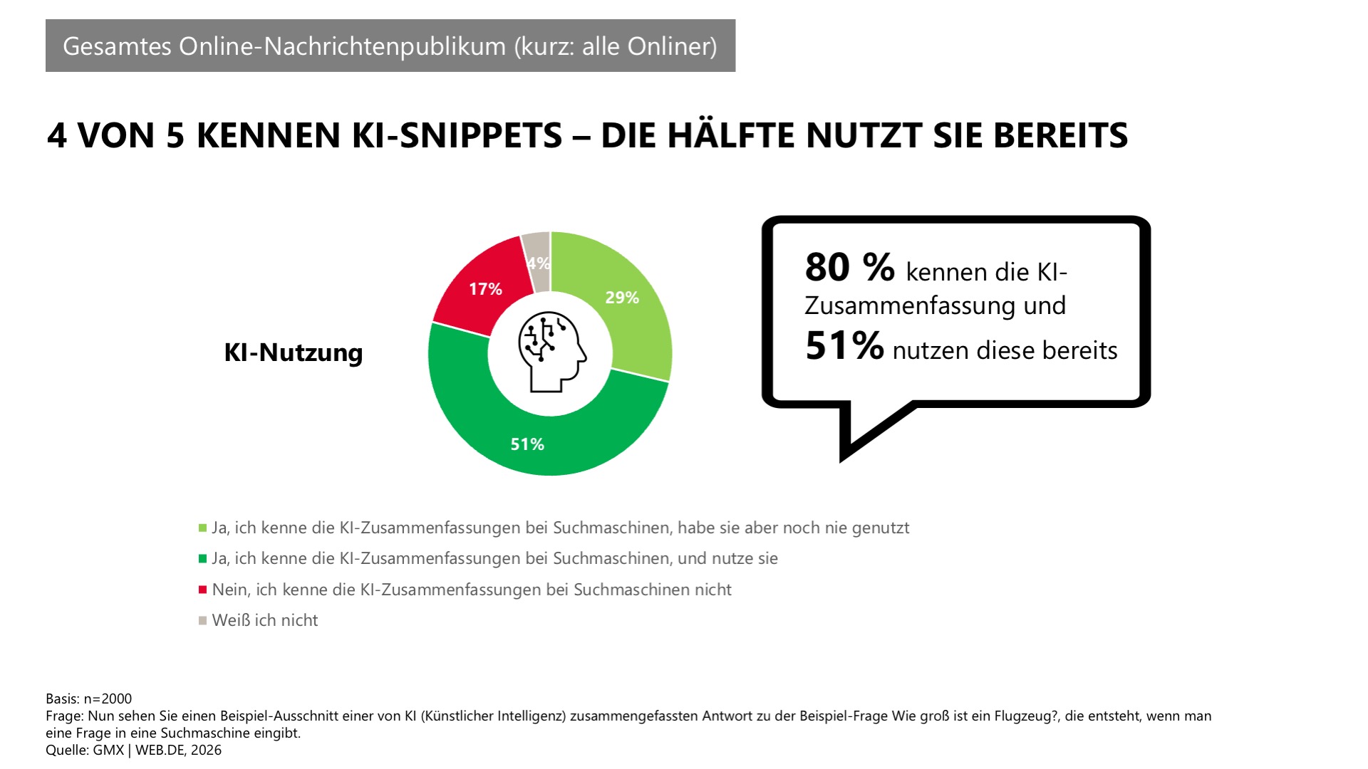 Googeln war gestern, die Informationssuche mit KI gehört bei der Gen Z zum Alltag: So kennen nicht nur 95 Prozent KI-Zusammenfassungen, sie werden auch von 58 Prozent genutzt. Beim gesamtem Online-Nachrichtenpublikum (kurz: alle Onliner) liegen die Werte mit 80 Prozent Bekanntheit und 51 Prozent Nutzung deutlich niedriger. Das zeigt die aktuelle Studie „So liest Deutschland Online-Nachrichten 2026“ im Auftrag der E-Mail- und News-Anbieter GMX und WEB.DE.