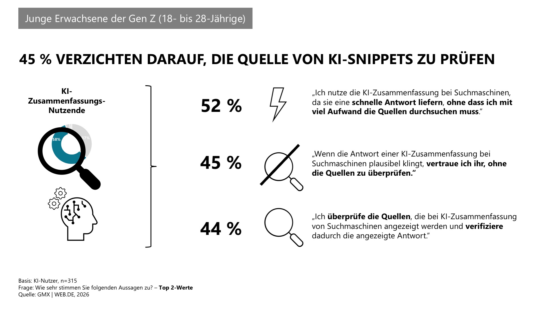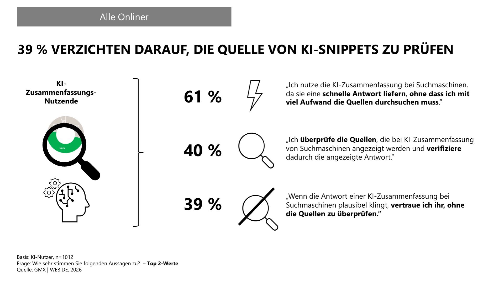 Den mit KI schnell und bequem erstellten Suchergebnissen („KI-Snippets“) wird häufig vertraut: 45 Prozent der 18- bis 28-Jährigen überprüfen die zugrunde liegende Quelle nicht, sofern die KI-Zusammenfassung plausibel erscheint. Insgesamt verzichten 39 Prozent der Onliner auf eine Überprüfung.