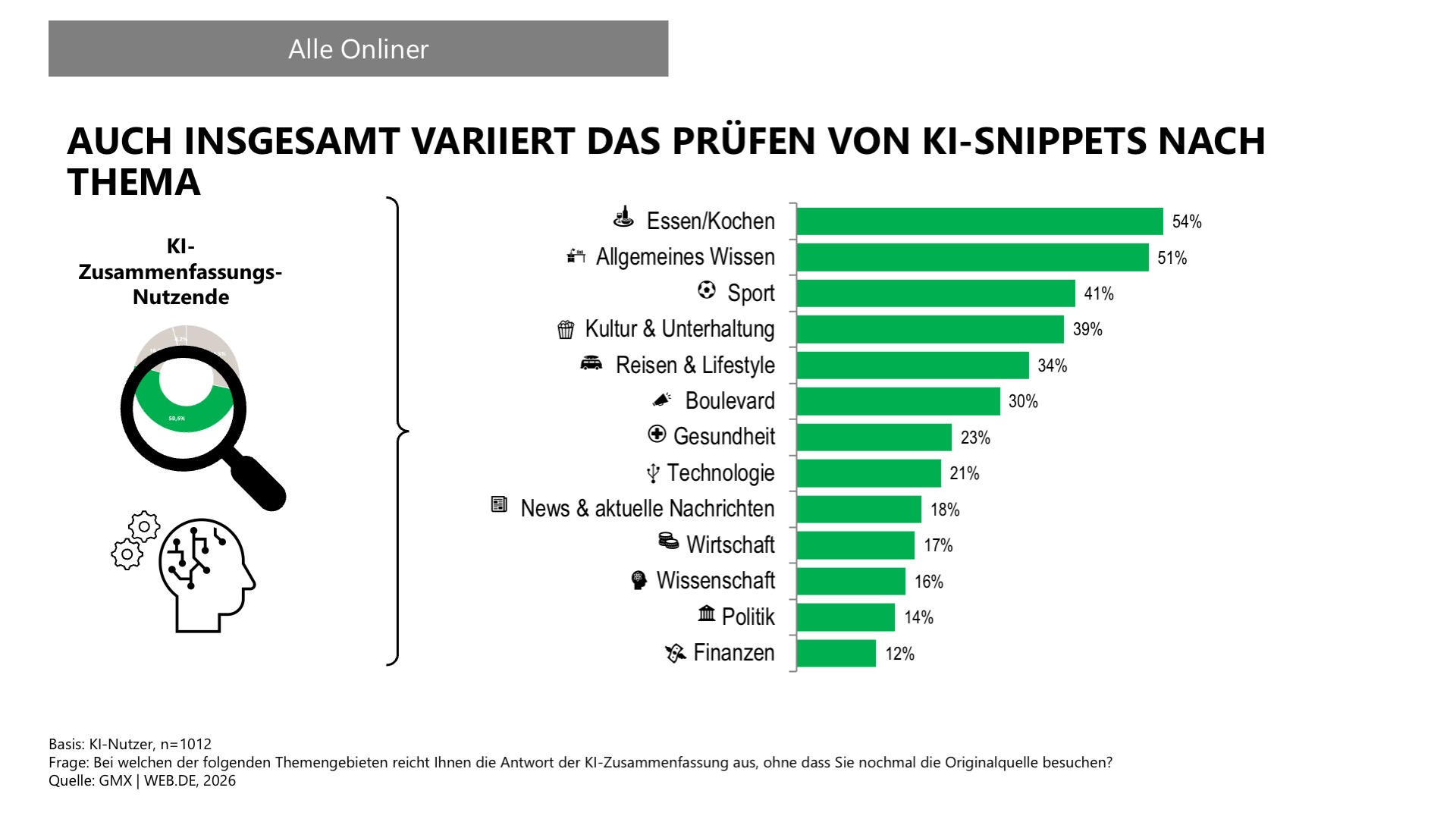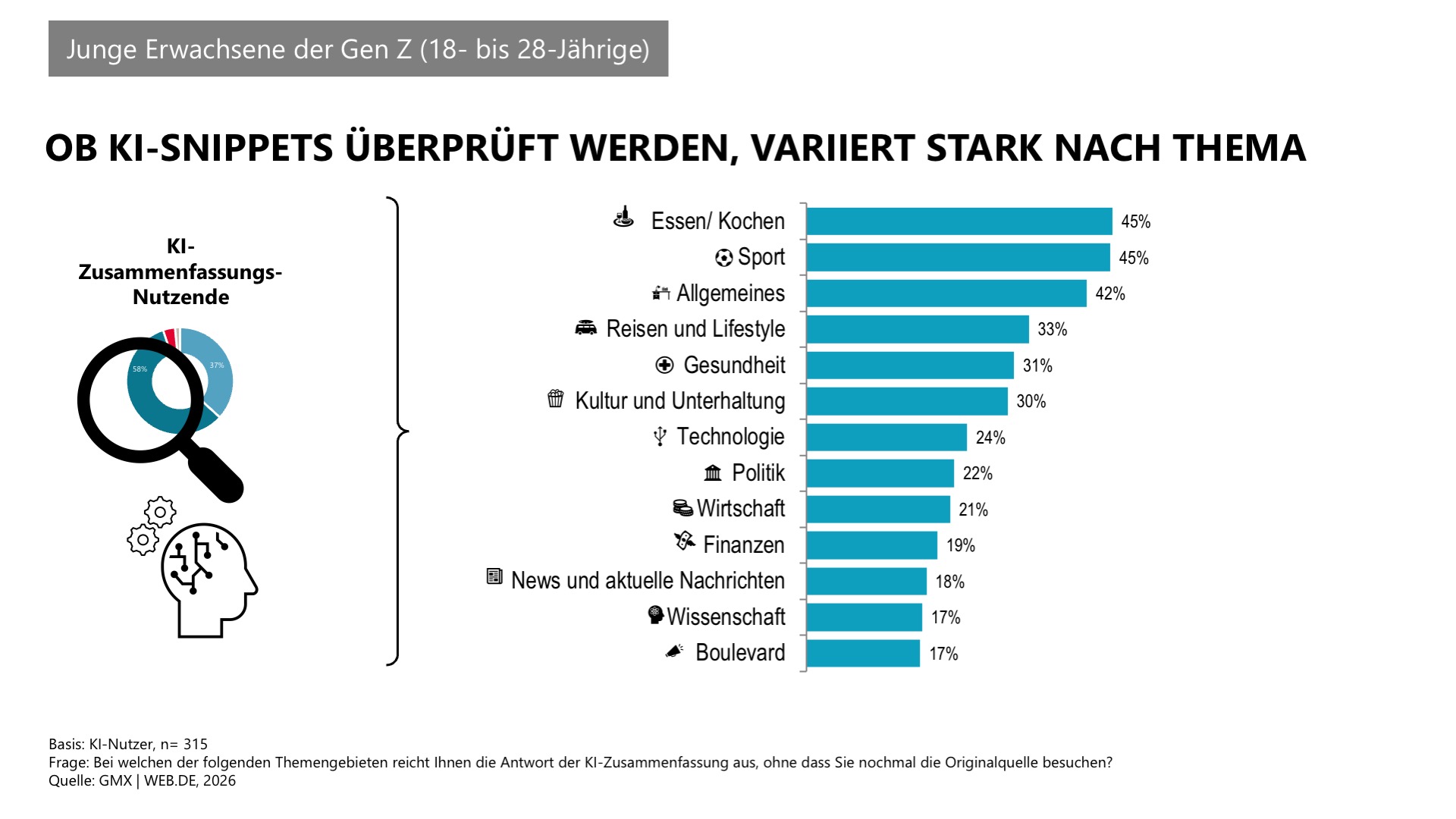 Wie stark KI-Zusammenfassungen überprüft werden, hängt vom Thema ab. Besonders hoch ist das Vertrauen der Gen Z bei alltagsnahen Themen wie Essen und Kochen sowie Sport (je 45 %). Auch für allgemeine Themen (42 %) sowie Reisen und Lifestyle (33 %) werden KI-Antworten häufig akzeptiert. Deutlich kritischer sind die 18- bis 28-Jährigen dagegen bei Boulevard (17 %), Wissenschaft (17 %) sowie News und aktuellen Nachrichten (18 %). Eine große Mehrheit greift hier auf die Originalquelle zurück.