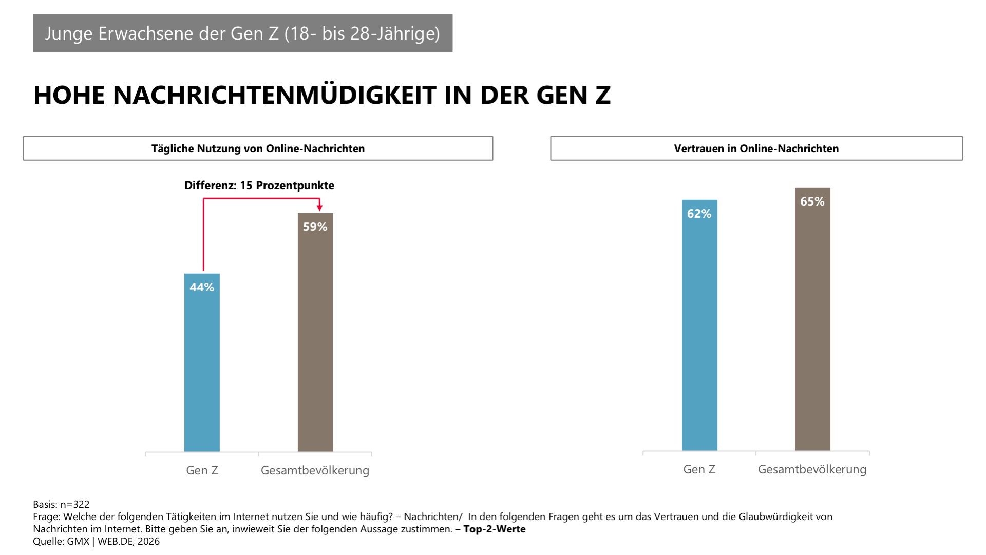 Nur 44 Prozent der Gen Z lesen täglich Online-News – das sind 15 Prozentpunkte weniger als beim gesamten Online-News-Publikum (59 %). Während 65 Prozent aller Onliner angeben, Nachrichten zu vertrauen, sind es in der Gen Z 62 Prozent.“Die Gen Z informiert sich schneller als jede Generation zuvor. Doch wenn fast die Hälfte KI-Antworten ungeprüft übernimmt und zugleich weniger Nachrichten konsumiert werden, entsteht ein gefährliches Vakuum. Gerade hier wird klar, wie unverzichtbar Journalismus ist: Er liefert nicht nur Antworten, sondern geprüfte Quellen, Kontext und Verantwortung“, sagt Thomas Rebbe, Chefredakteur von GMX und WEB.DE.