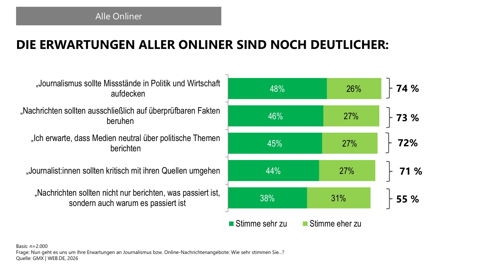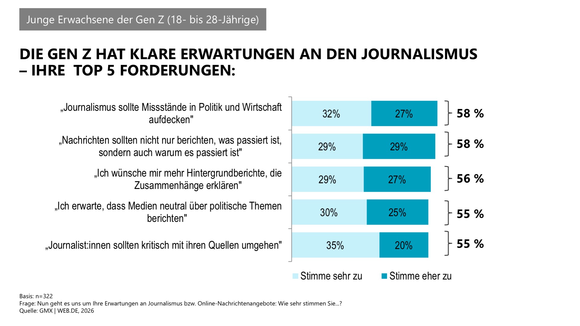 Trotz geringerer Nutzung von Online-Nachrichten stellt die Mehrheit der Gen Z klare Anforderungen an den Journalismus: Im Vordergrund steht der Wunsch, dass Missstände in Politik und Wirtschaft aufdeckt werden (58 %). Fast ebenso wichtig ist, dass Medien nicht nur berichten, was passiert ist, sondern auch die Gründe erklären (58 %). Viele junge Befragte erwarten zudem, dass Journalistinnen und Journalisten neutral über politische Themen berichten und kritisch mit ihren Quellen umgehen (je 55 %). Unter allen Onlinern sind diese Erwartungen an die Presse mit rund 70 Prozent Zustimmung allerdings deutlich weiterverbreitet.