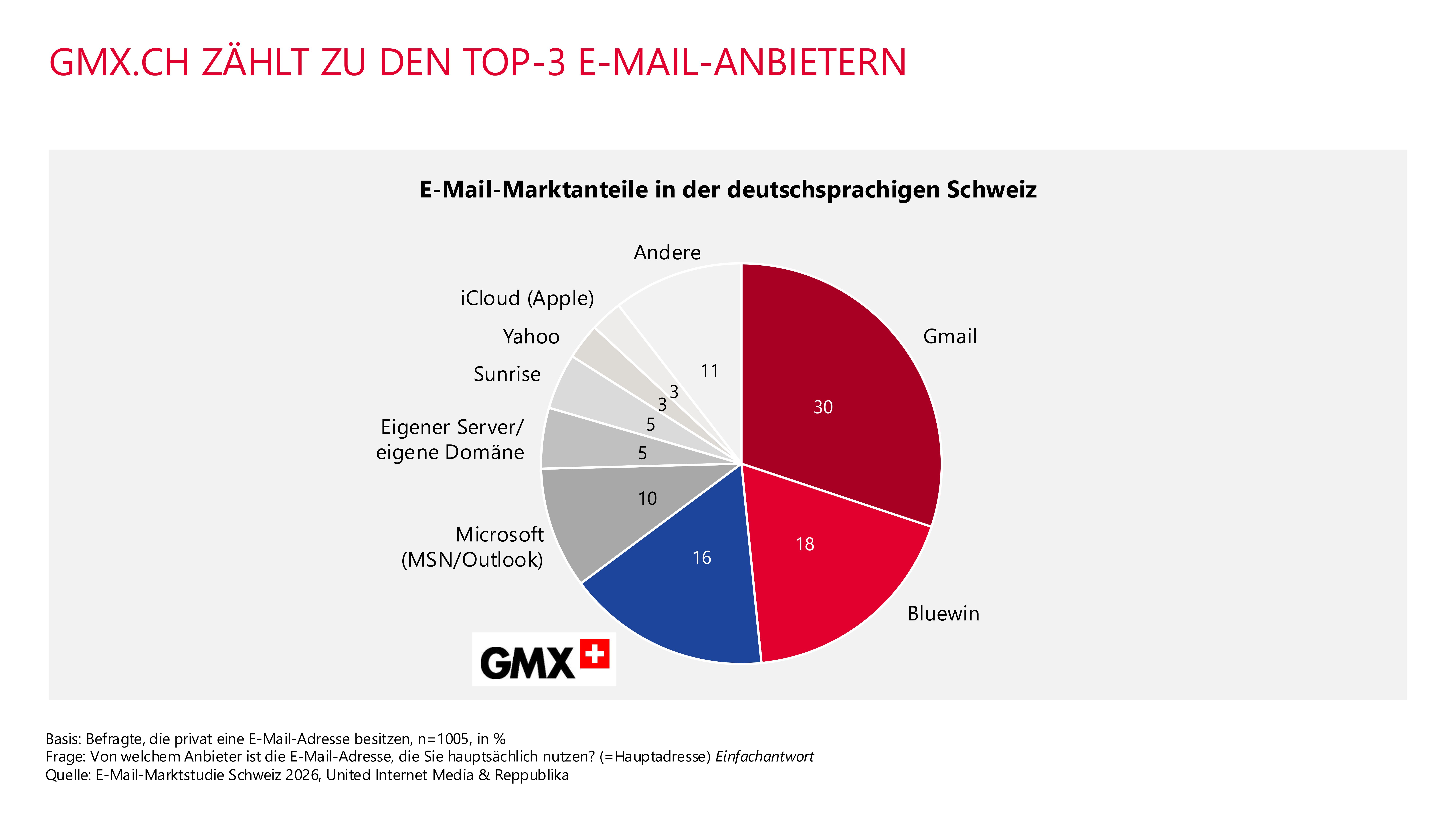 16 Prozent der deutschsprachigen Onliner in der Schweiz nutzen GMX.ch als Haupt-E-Mail-Adresse.