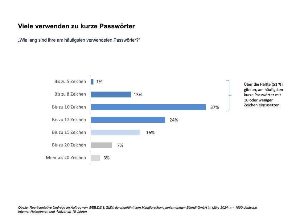 Gut die Hälfte der Deutschen (51%) nimmt es mit der Passwortlänge nicht so genau. Jeder und jede Sechste (14 %) gibt an, bei den am häufigsten verwendeten Passwörtern auf maximal 8 oder weniger Zeichen Länge zu setzen. 37 Prozent nutzen höchstens zehn Zeichen. Das hat eine repräsentative Umfrage von Bilendi (2024) im Auftrag von GMX und WEB.DE herausgefunden.